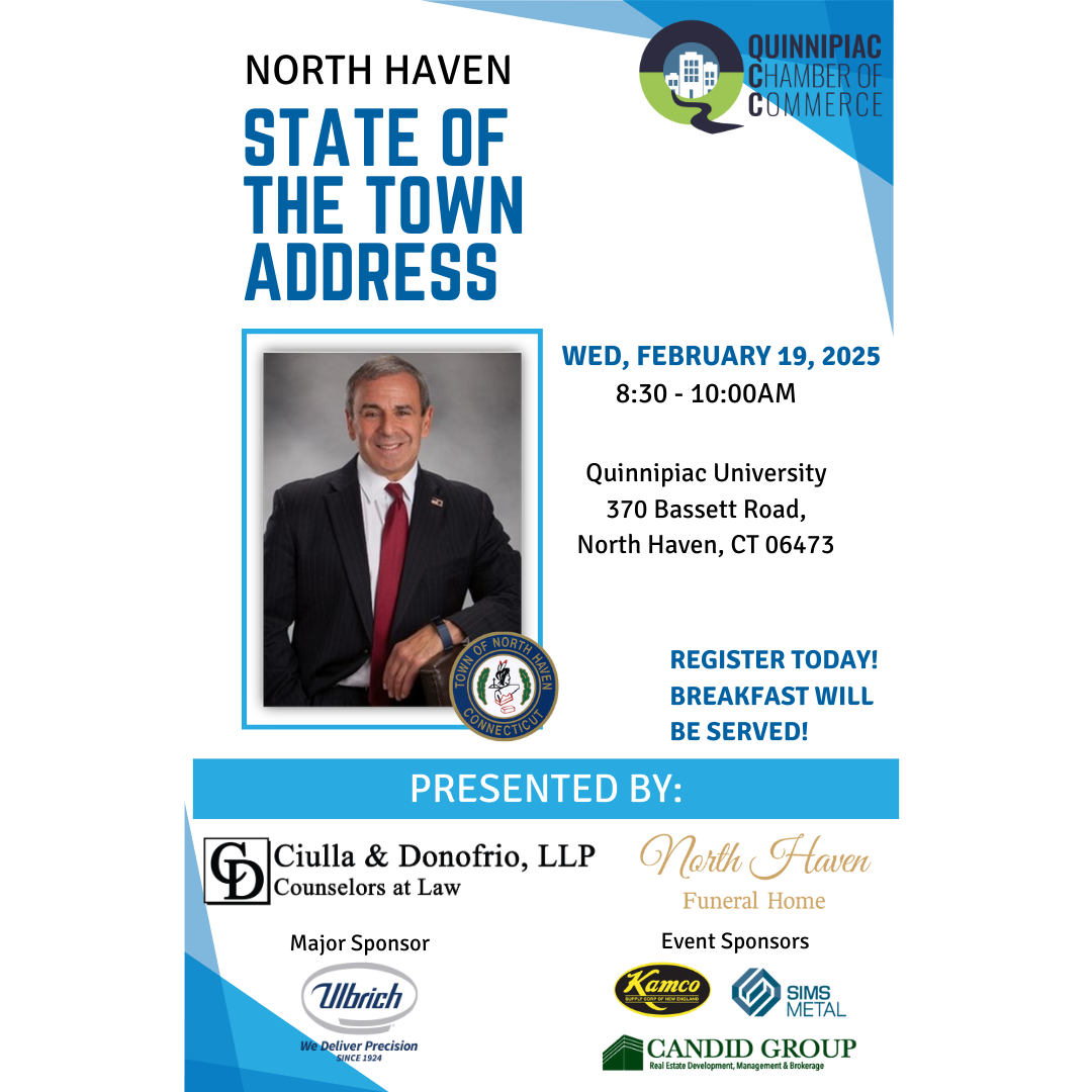 North Haven State of the Town Address- 2/19/25 Quinnipiac Chamber of Commerce Share: facebook-f icon linkedin-in icon Twitter icon pinterest-p icon envelope icon Register Today!